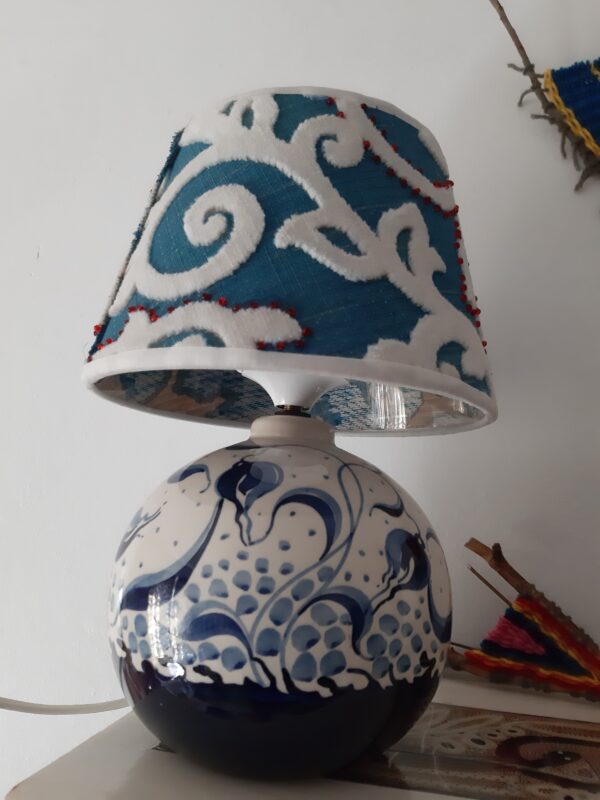 Blauw-witte lampenkap met kraaltjes op blauw-witte lampvoet